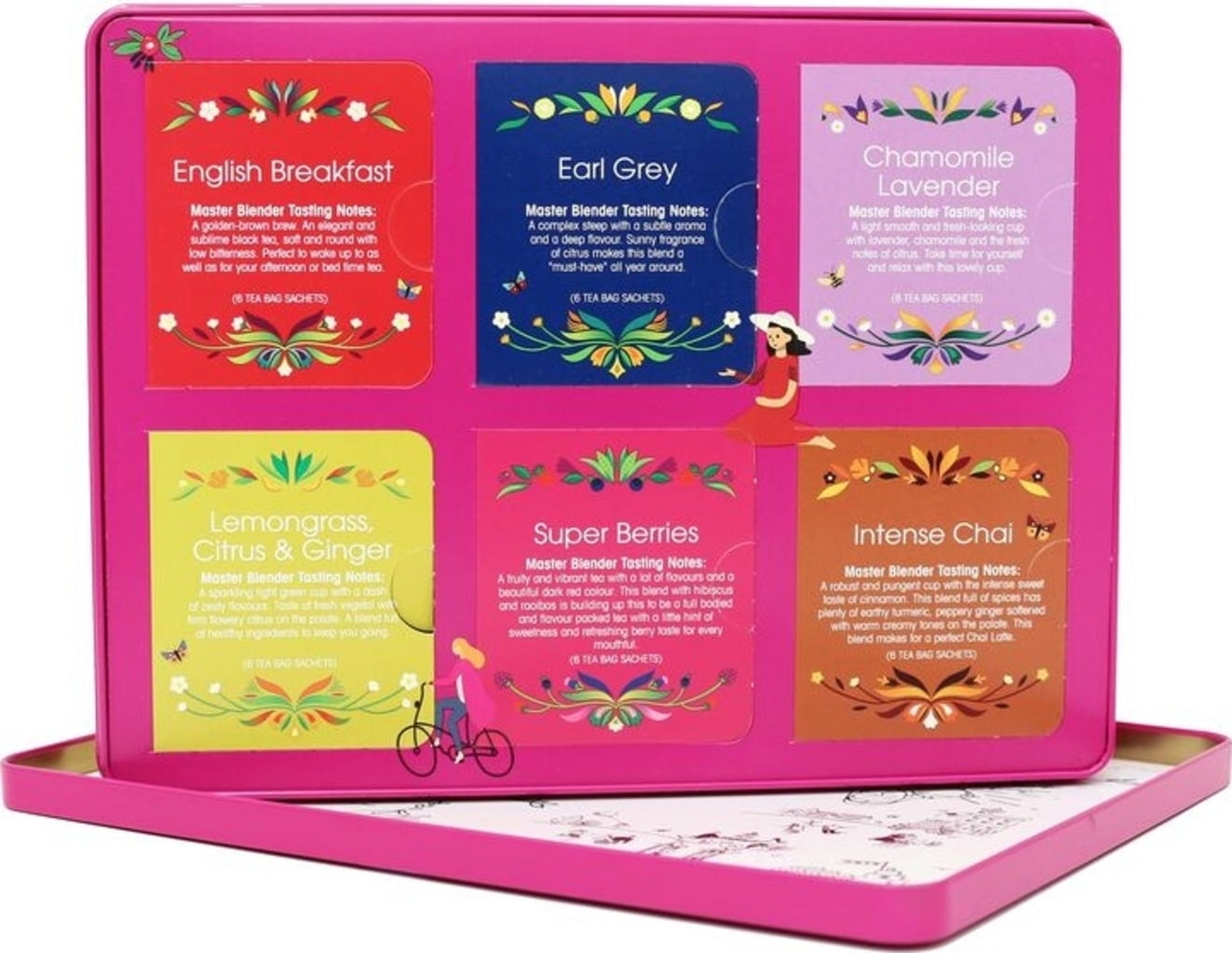 Każda odmiana jest reprezentowana przez 6 torebek - można je wypróbować, podzielić, zamienić i porównać według uznania! Pięknie zaprojektowane pudełko upominkowe wykonane jest z wytłaczanego metalu, zapewnia porządek w każdej kuchni i może być wielokrotnie uzupełniane. W zestawie 36 torebek herbaty.