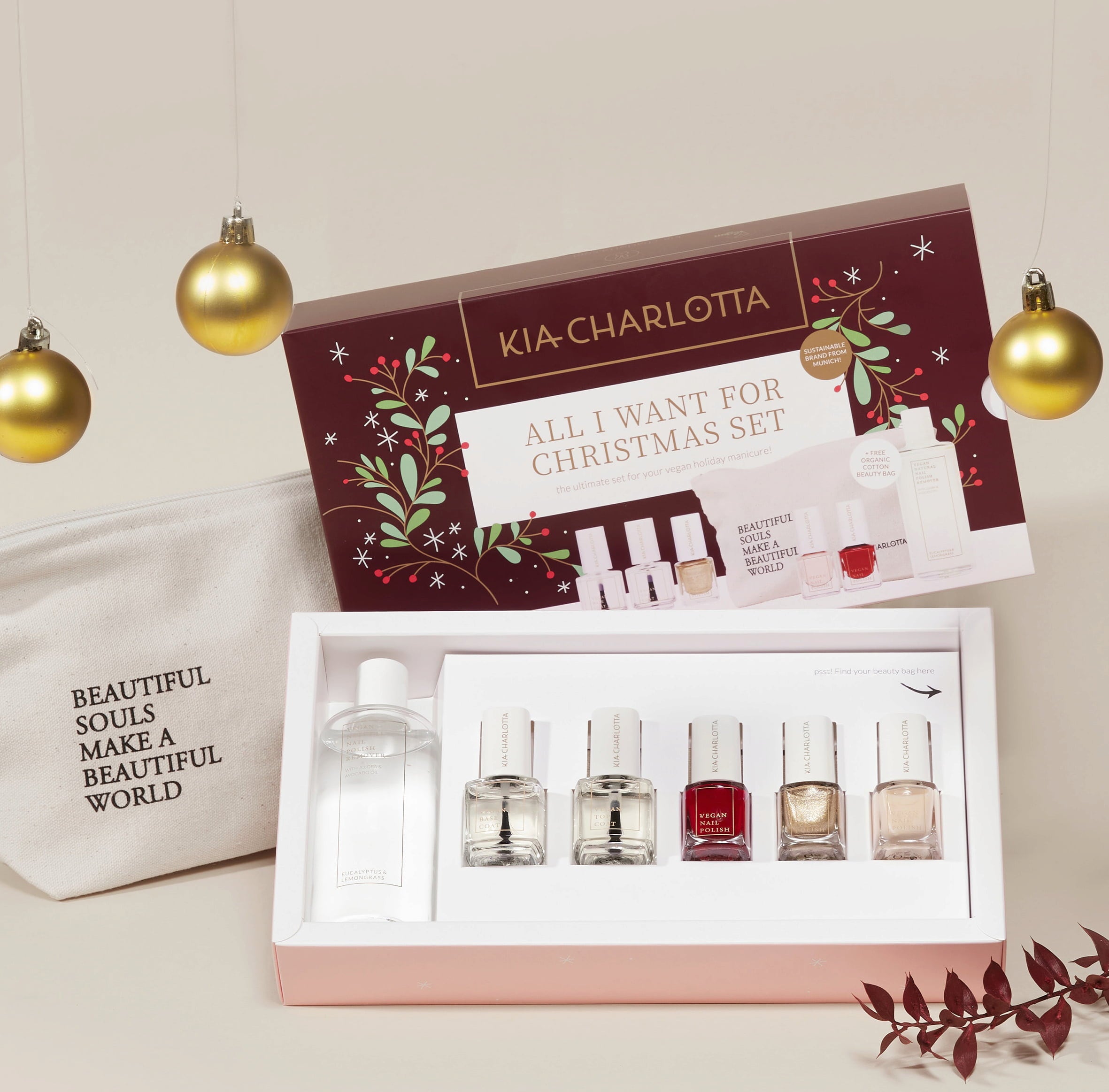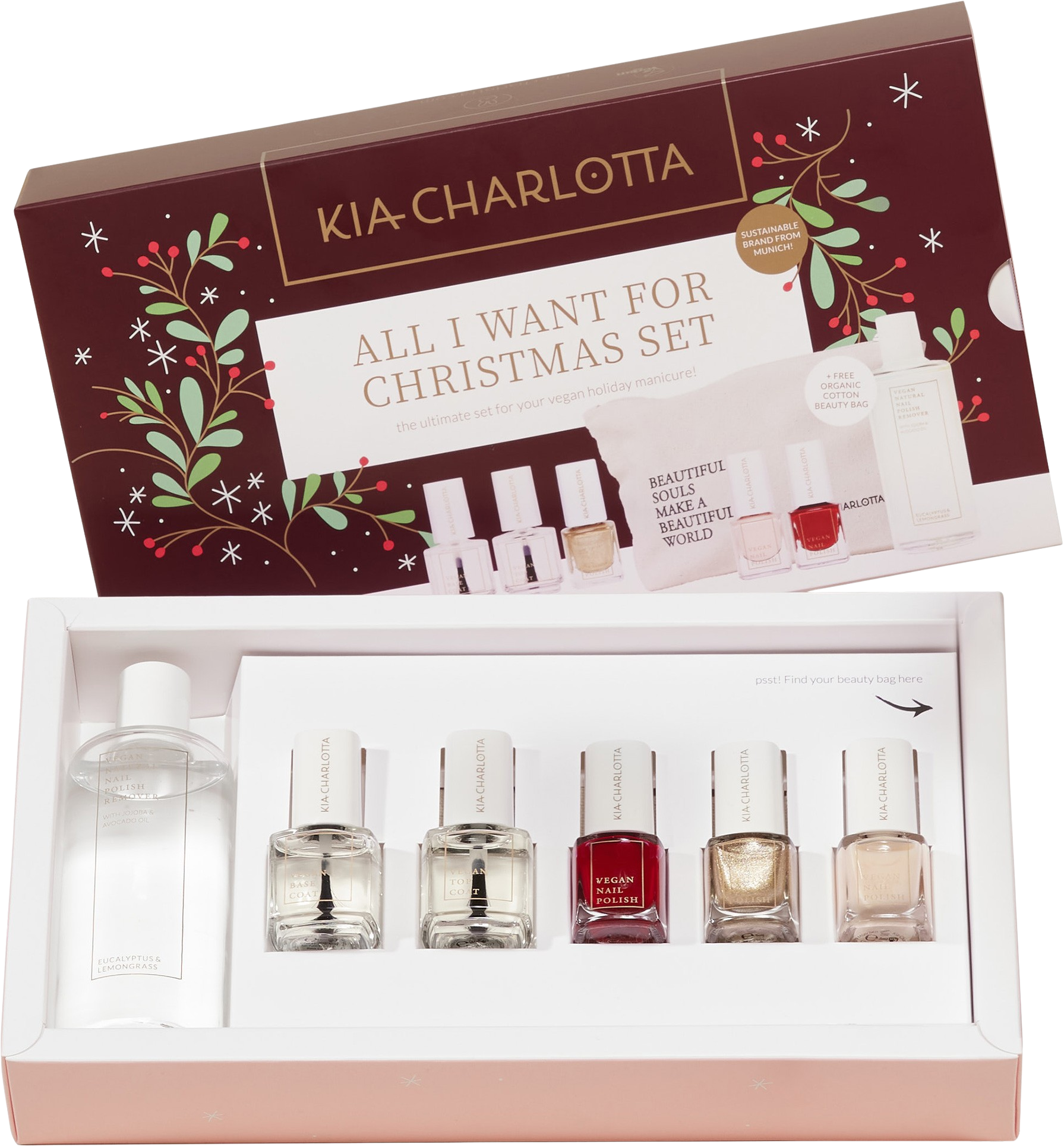 Zestaw All I want for Christmas od Kia-Charlotta oferuje wszystko, czego potrzebujesz do świątecznego manicure: bazę i top coat, trzy kolory lakieru do paznokci oraz odżywczy zmywacz do paznokci. Te niezbędne akcesoria są zapakowane w eleganckie pudełko prezentowe, które zawiera również piękną kosmetyczkę. Zaskocz swoich bliskich lub podaruj sobie magiczne chwile w te Święta.