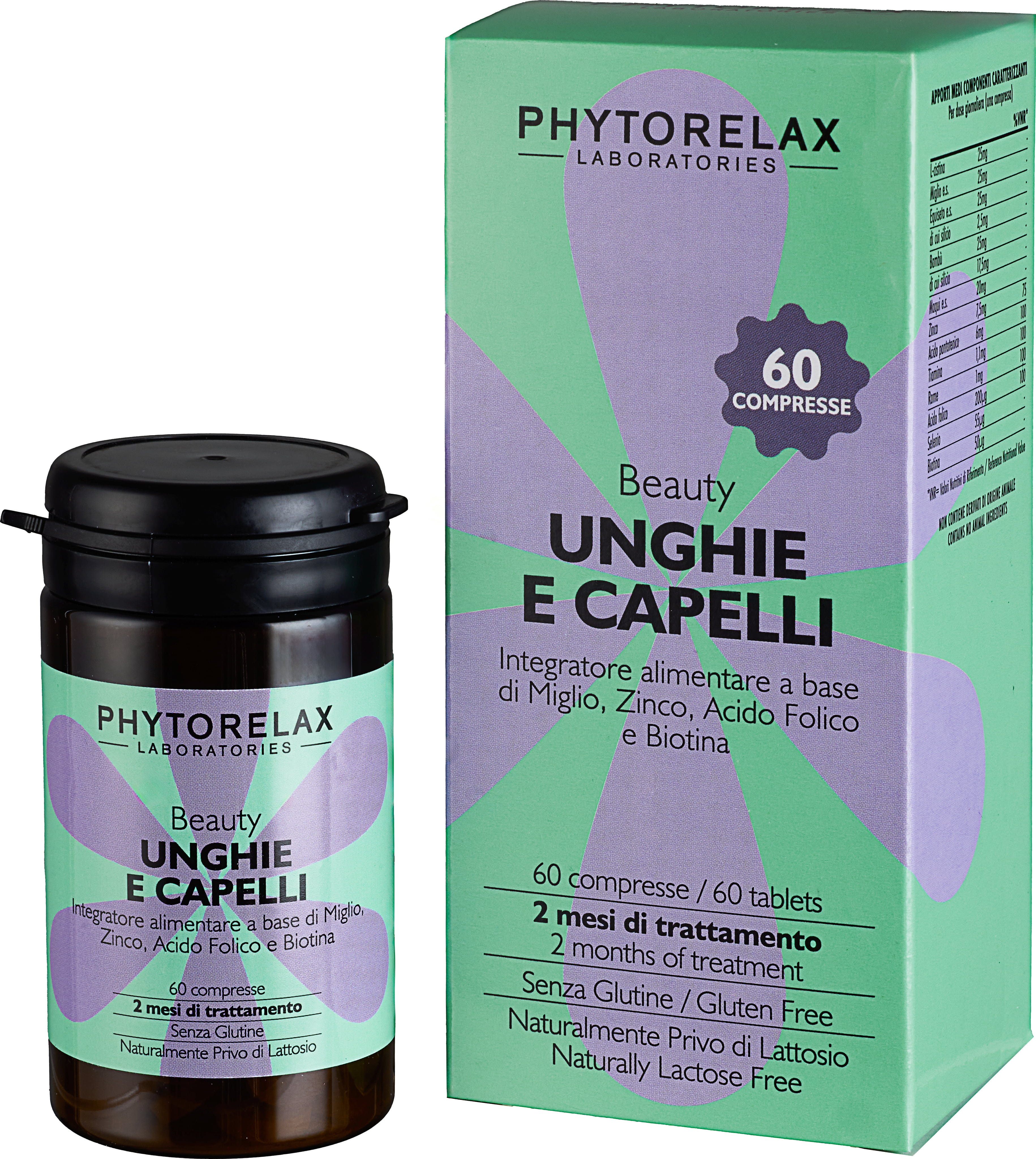 Phytorelax Beauty Unghie E Capelli to suplement diety w praktycznej formie tabletek do codziennego stosowania. Formuła łączy różne witaminy, minerały i ekstrakty roślinne, które są powszechnie stosowane w suplementach do włosów i paznokci. Kompaktowa tabletka jest łatwa do przyjęcia i może być elastycznie zintegrowana z codziennym życiem. Bez glutenu i laktozy, celowo zredukowana formuła, bez zbędnych dodatków.