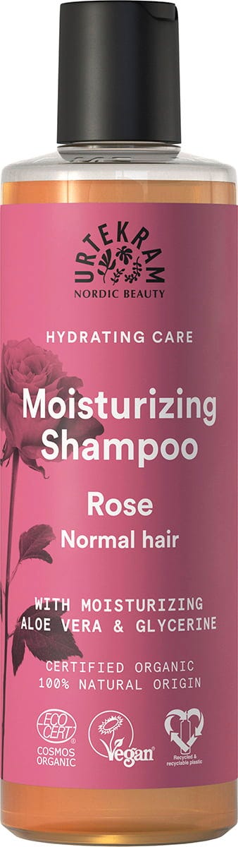 Szampon URTEKRAM przeznaczony do mycia włosów normalnych o zniewalającym różanym zapachu. Lekko nawilża i odżywia włosy dzięki zawartości aloesu i gliceryny.